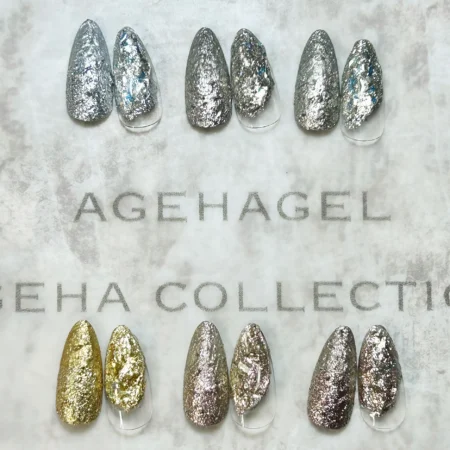 New metallic colors from Ageha Cream Art Gel Metal Paste Collection, featuring dense pastes of shiny, metallic flakes that look like inorganic material. Cream Art Gel, which is popular for its soft but non-flowing texture, is a color gel for art that can be mixed with charm on non-wipe to